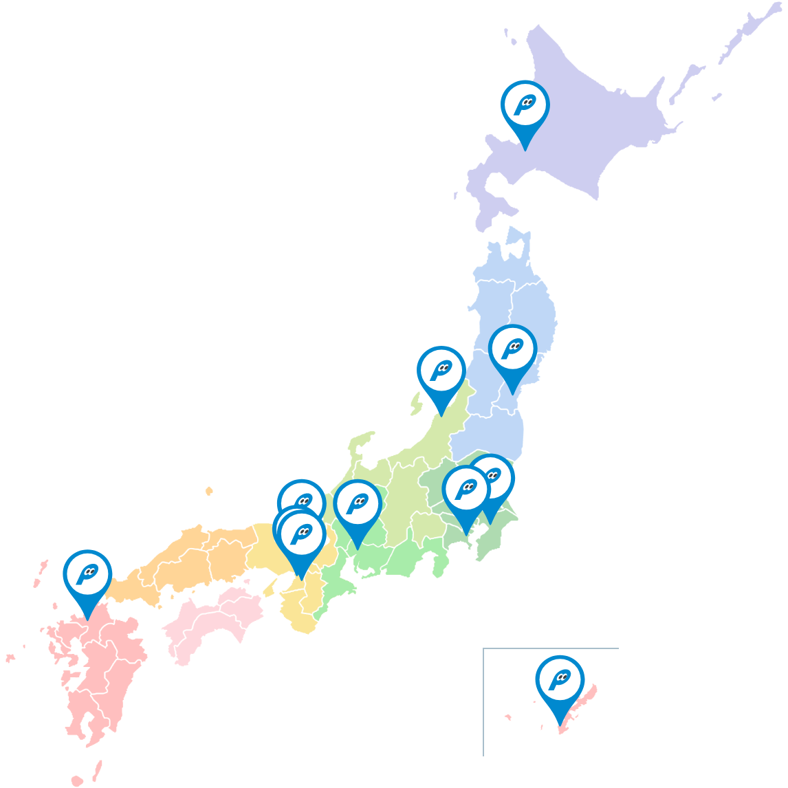 12拠点日本全国12箇所、東京、大阪(2箇所)、新潟、札幌、仙台、横浜、千葉、名古屋、京都、福岡、那覇に拠点を有しています。