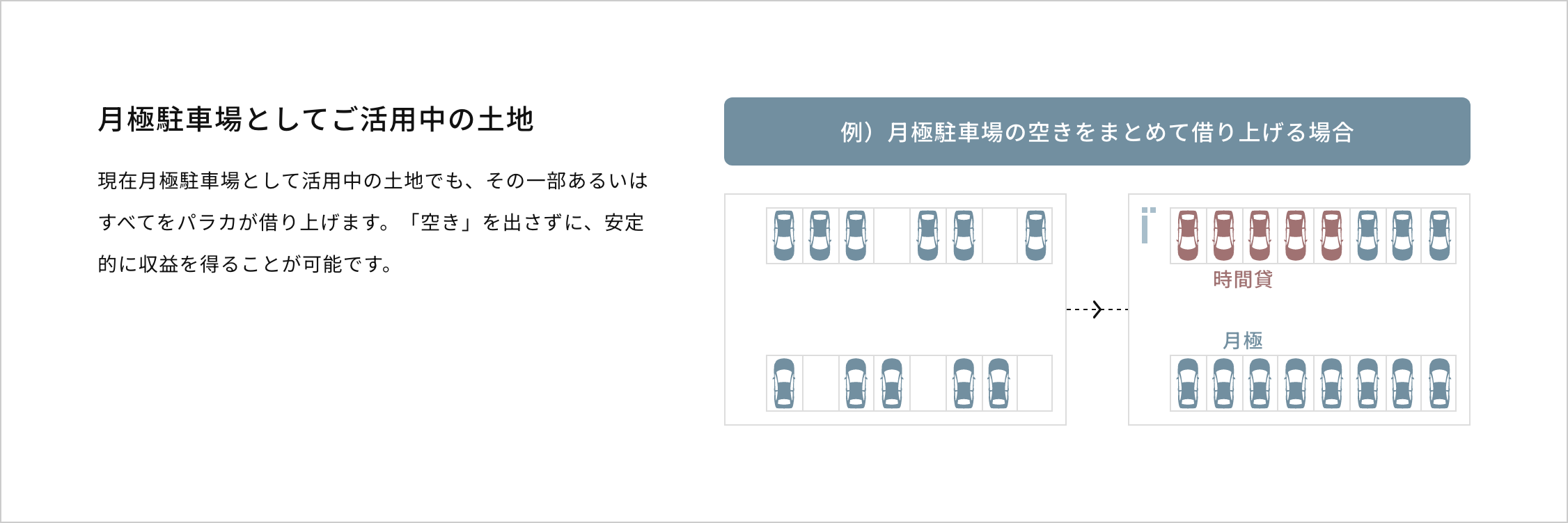 またパラカで土地をお借りして月極駐車場運営も積極的に行っているほか、オーナー様がお持ちの月極駐車場の募集のみなども請け負っています。