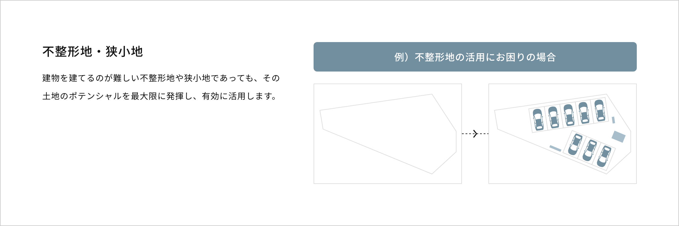 オフィスビルや住宅用地としては不向きとされる狭小地や不整形地も、当社が積極的に買い取ります。独自のノウハウとネットワークにより、奥行きが短く売却を諦めていた土地や、建築が難しく活用方法に悩んでいた土地も、その価値を最大限に引き出します。どのような土地でも、まずはお気軽にご相談ください。