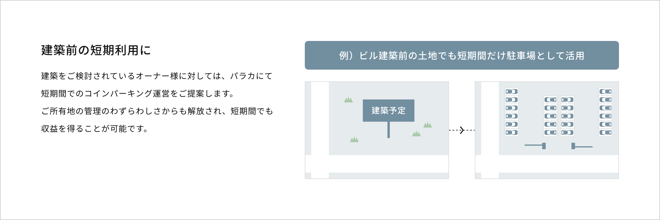 初期費用と運営にかかる費用は、すべて当社が負担します。万一の事故やトラブルも、当社が責任を持って対応いたします。更地はもちろん、既存の建物がある土地でもご相談ください。