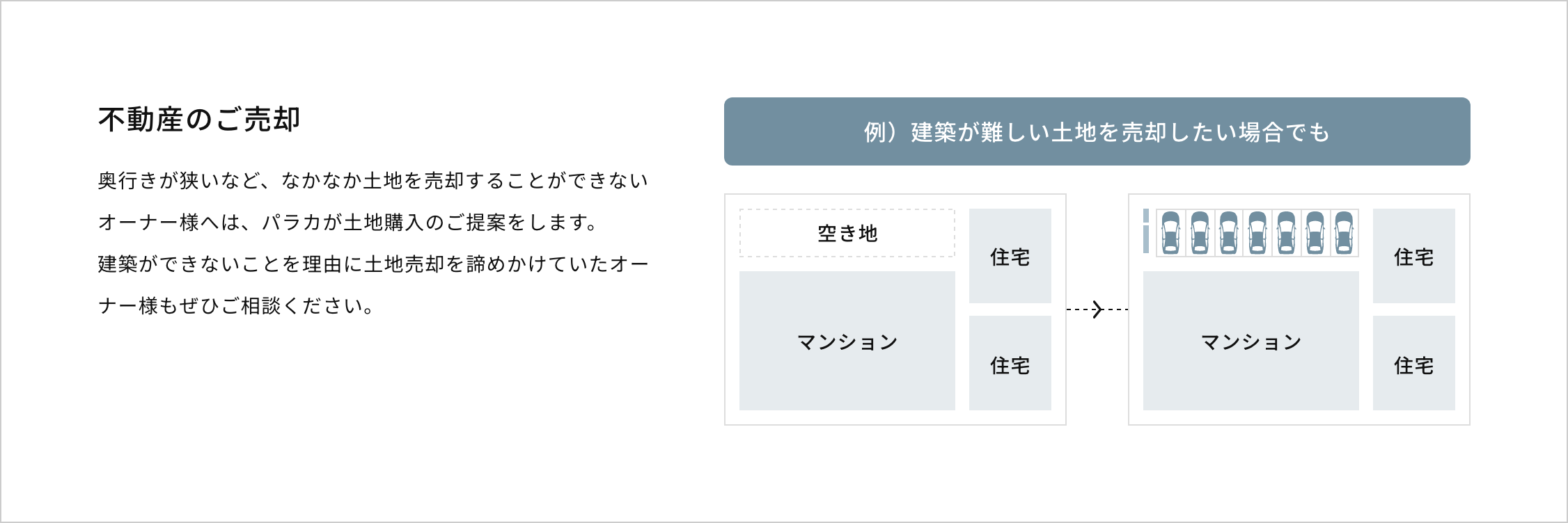 当社は、不動産デベロッパーとの協業体制を構築しています。これによりマンション建設やコンビニ誘致など、お客様の土地が持つポテンシャルを最大限に活かした幅広いご提案が可能です。「土地を売りたい」「貸したい」「収益を上げたい」といったお悩みがございましたら、まずはお気軽にご相談ください。